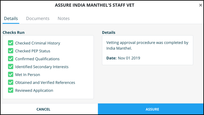 Assuring a staff member can be done through the ‘Staff Vetting Assurance’ section of the AMLHub desktop.