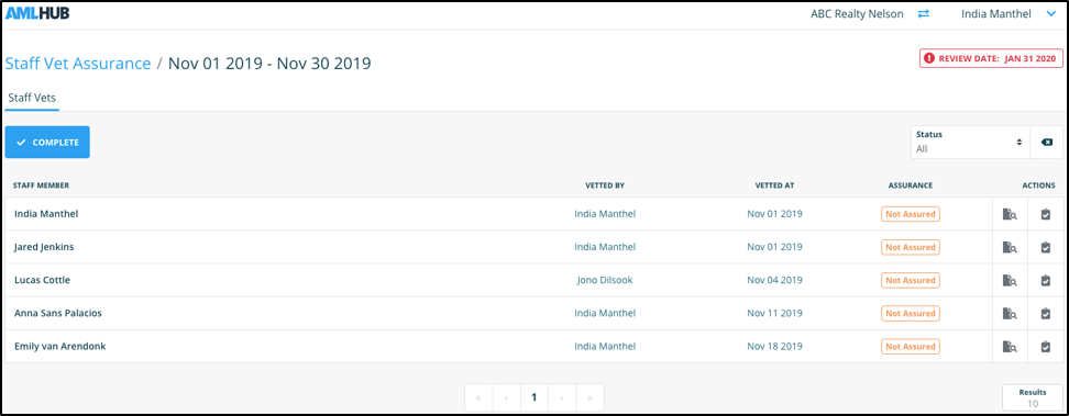 Completing an assurance period can be done through the ‘Staff Vetting Assurance’ section of the AMLHub desktop.